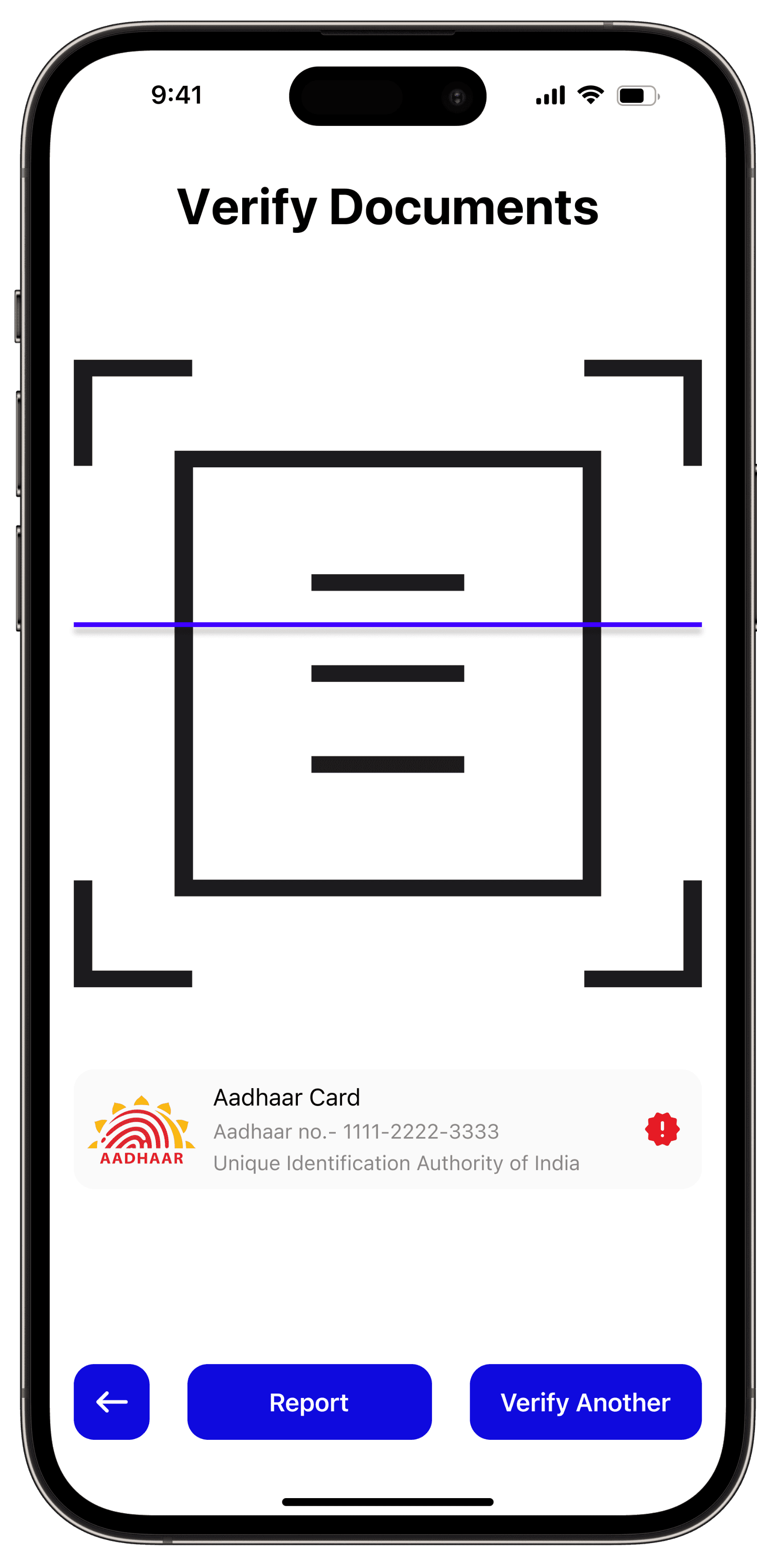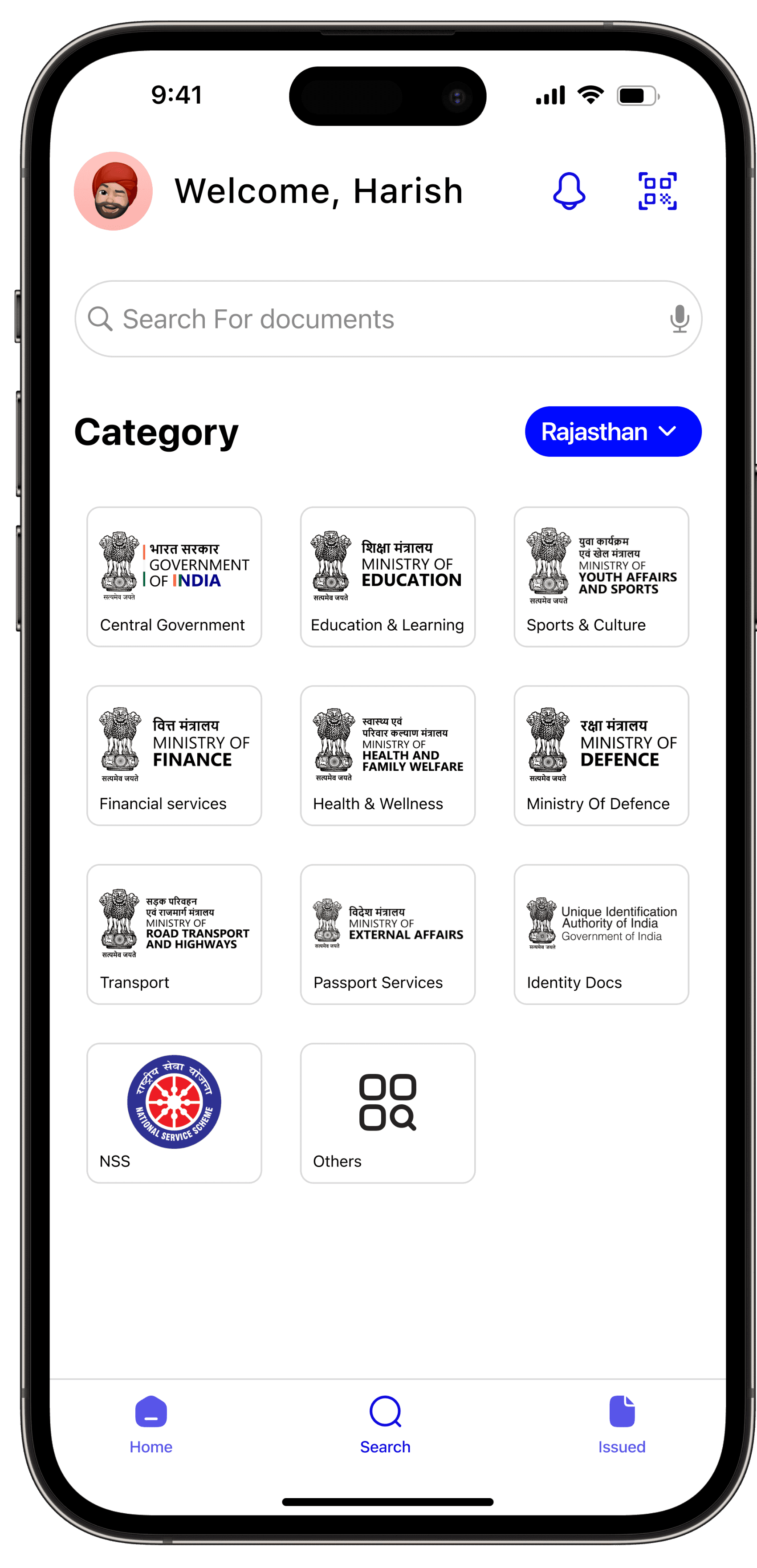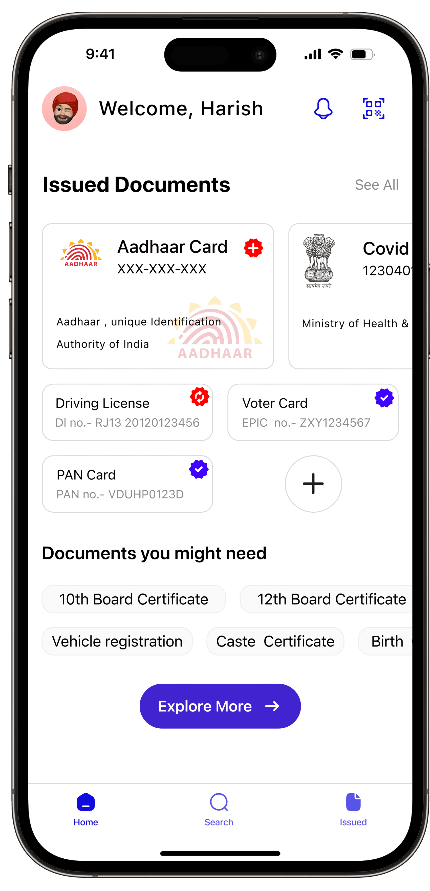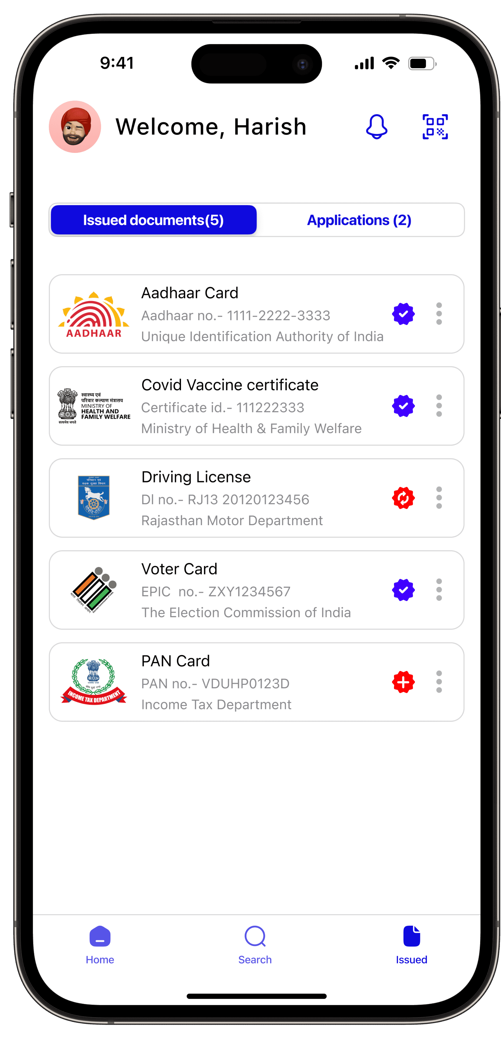 The homepage of the app displays the user's acquired documents, a notification icon, and a verification tool for document validation. Users can report any counterfeit documents through the app. Additionally, there are sections available for searching new and issued documents.