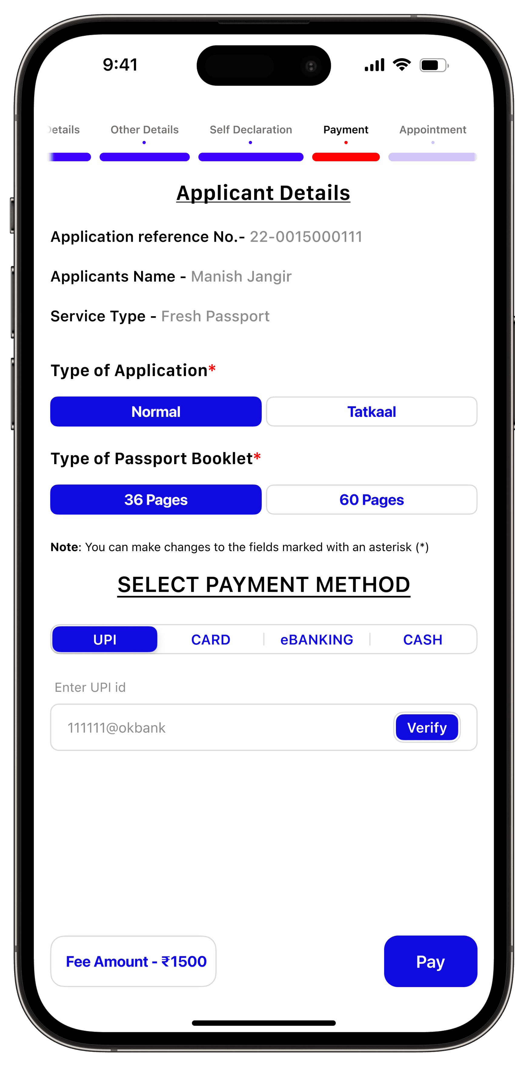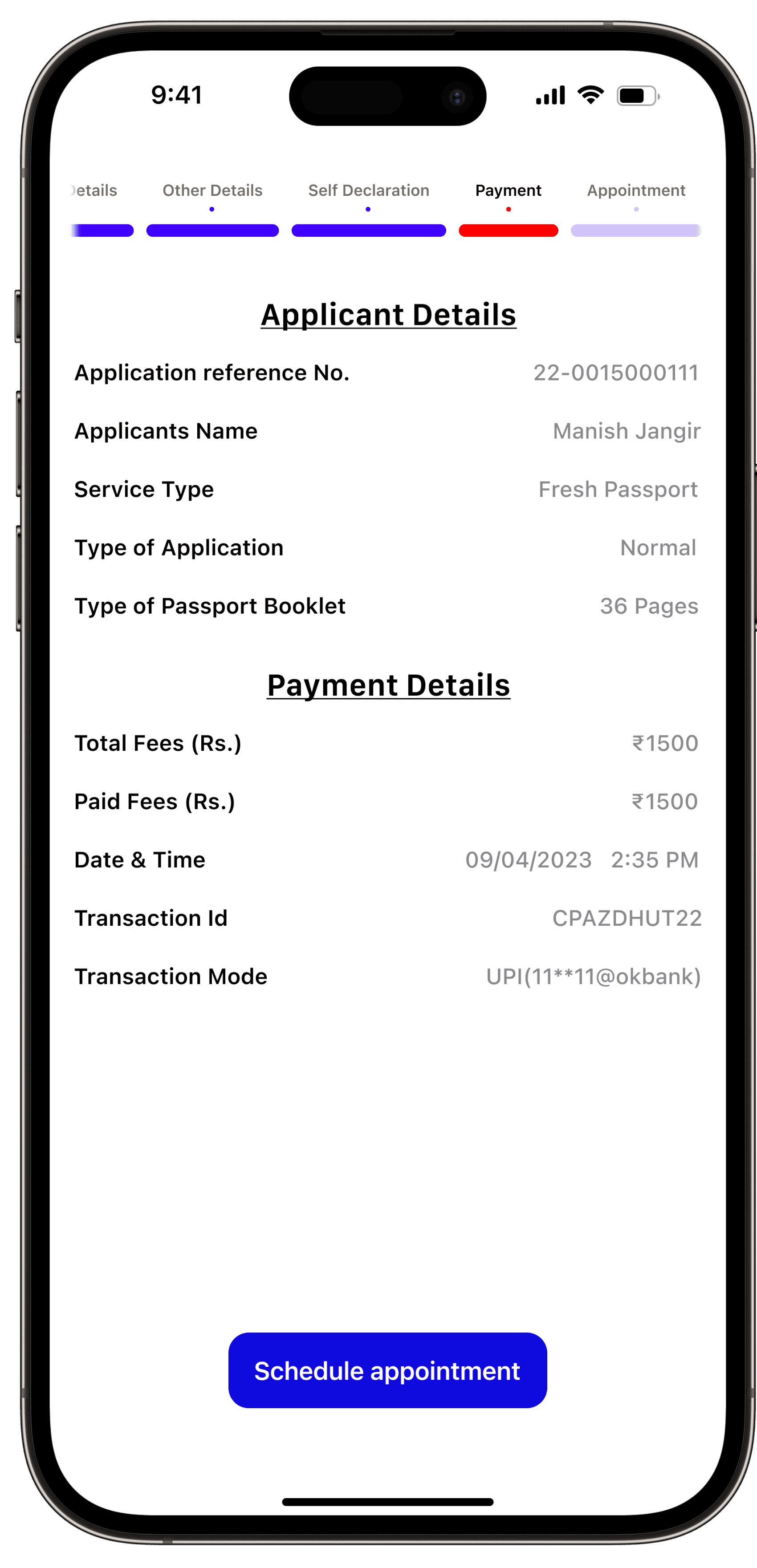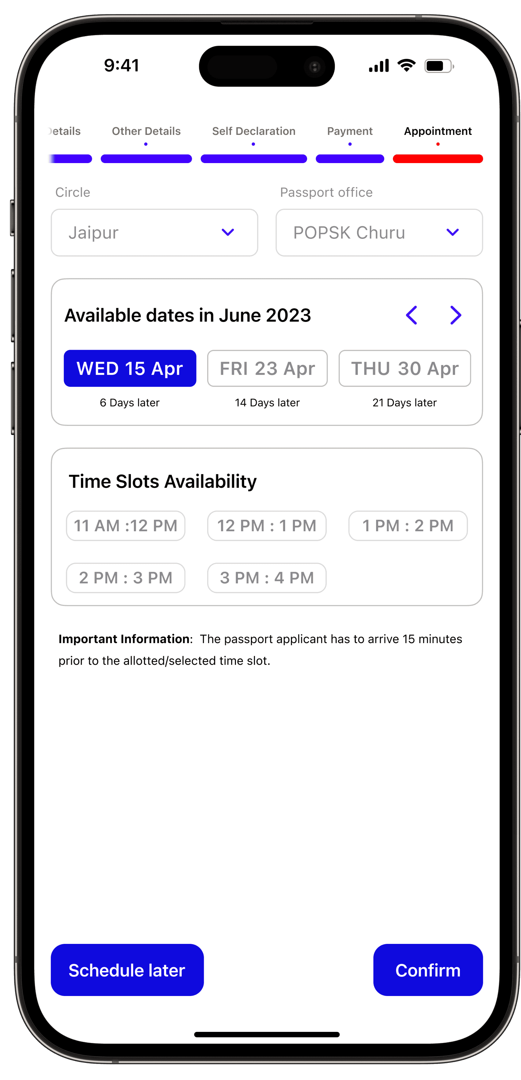 Users have the convenience of selecting from various payment methods, and the app provides a user-friendly way to display available appointment dates along with the days left for the appointment.