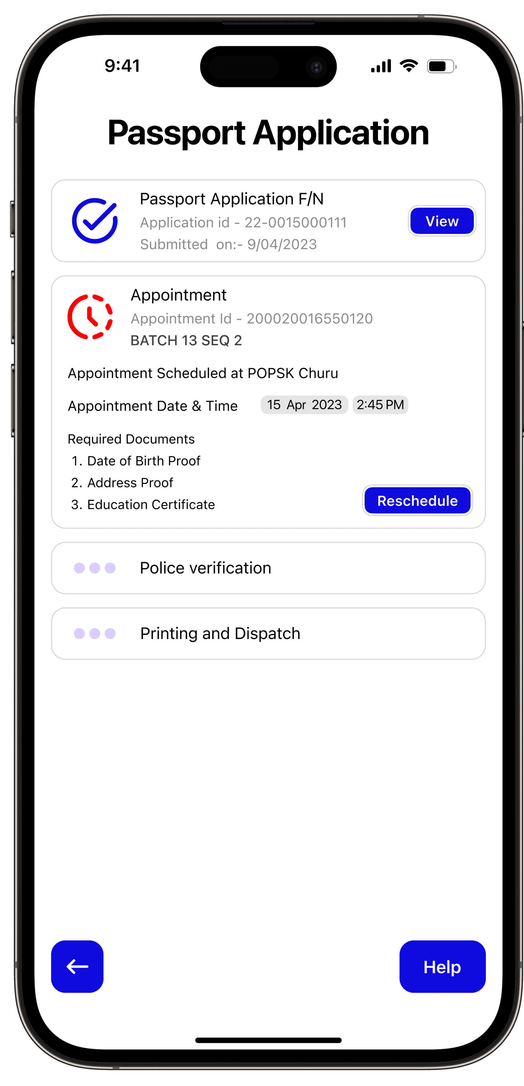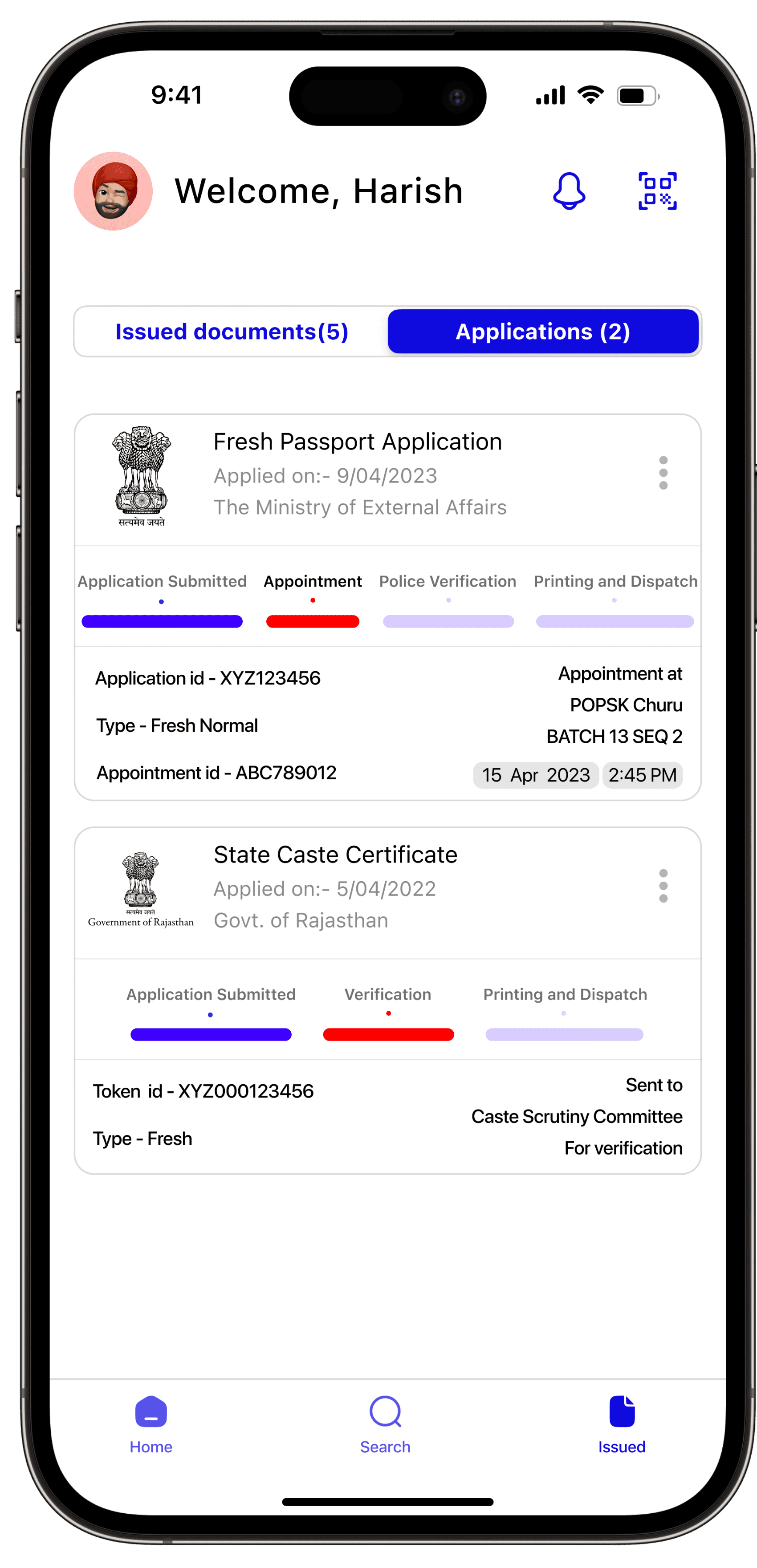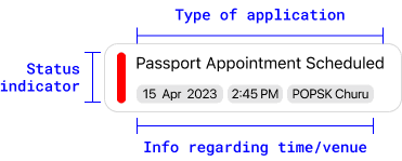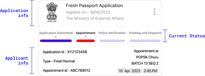 If a user applies for a document through NPOI, the app displays the next steps and current Status on the homepage.