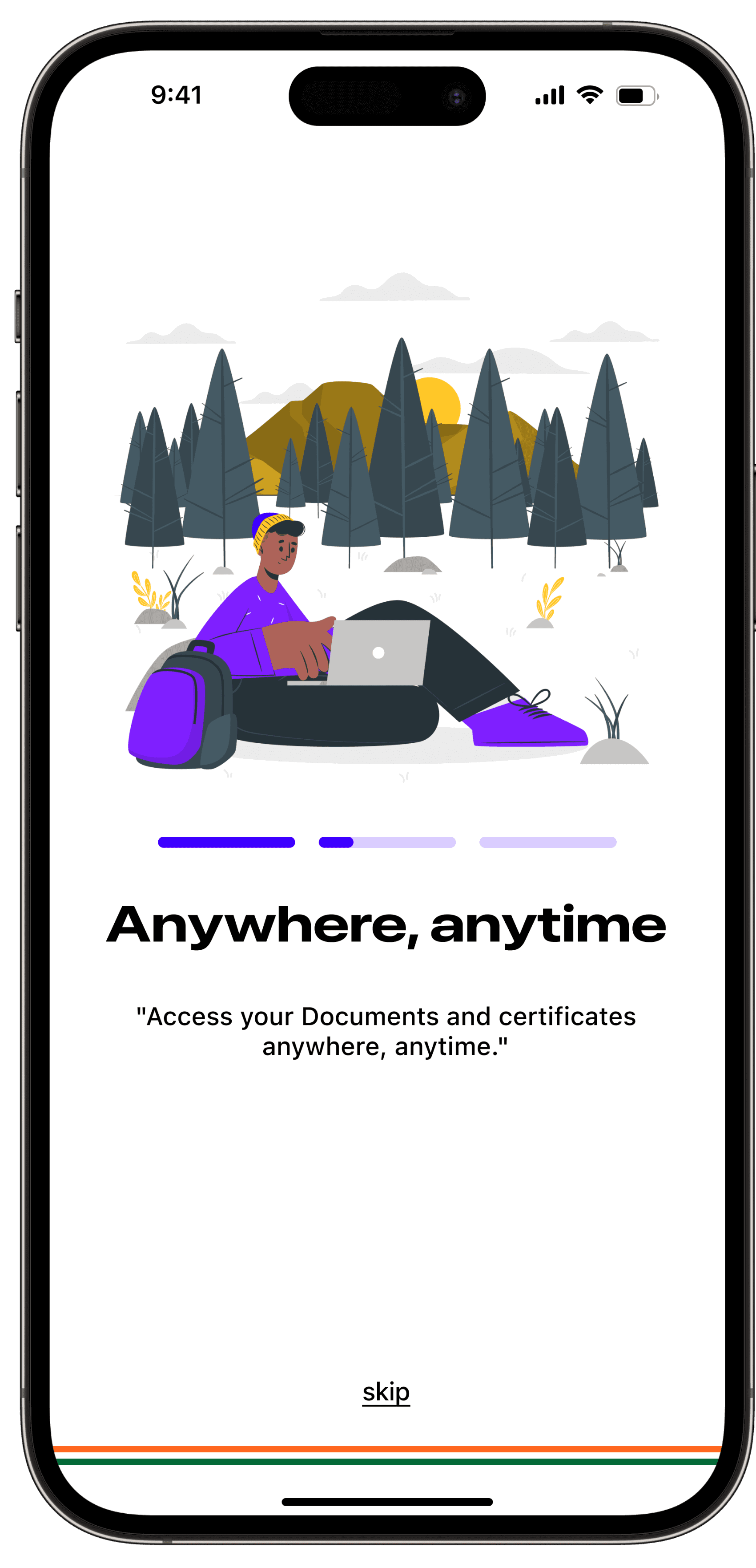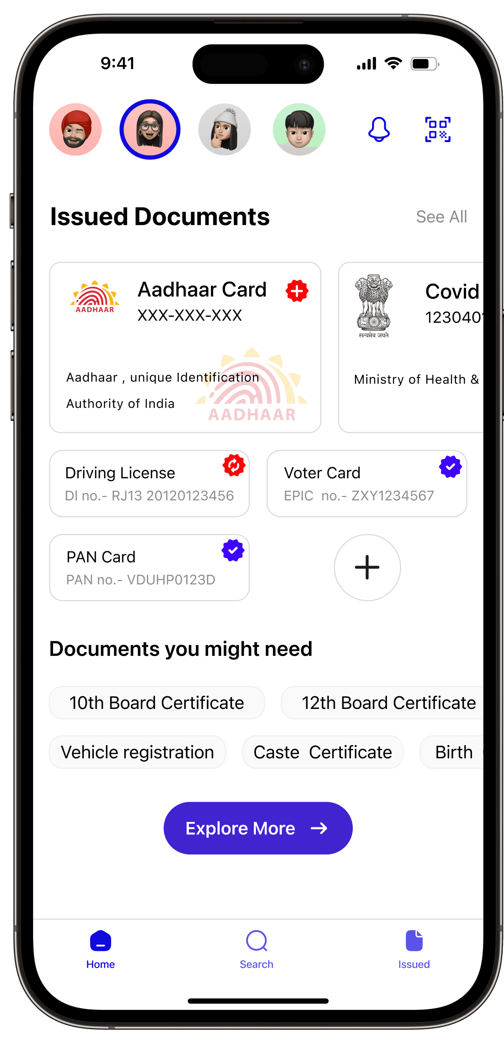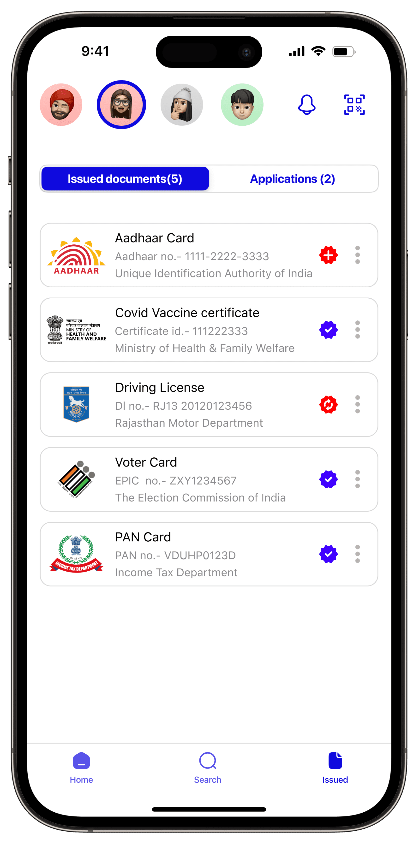 "Issued" page shows document information and status, including expiration and updates. Users can download and share their documents from this section.
